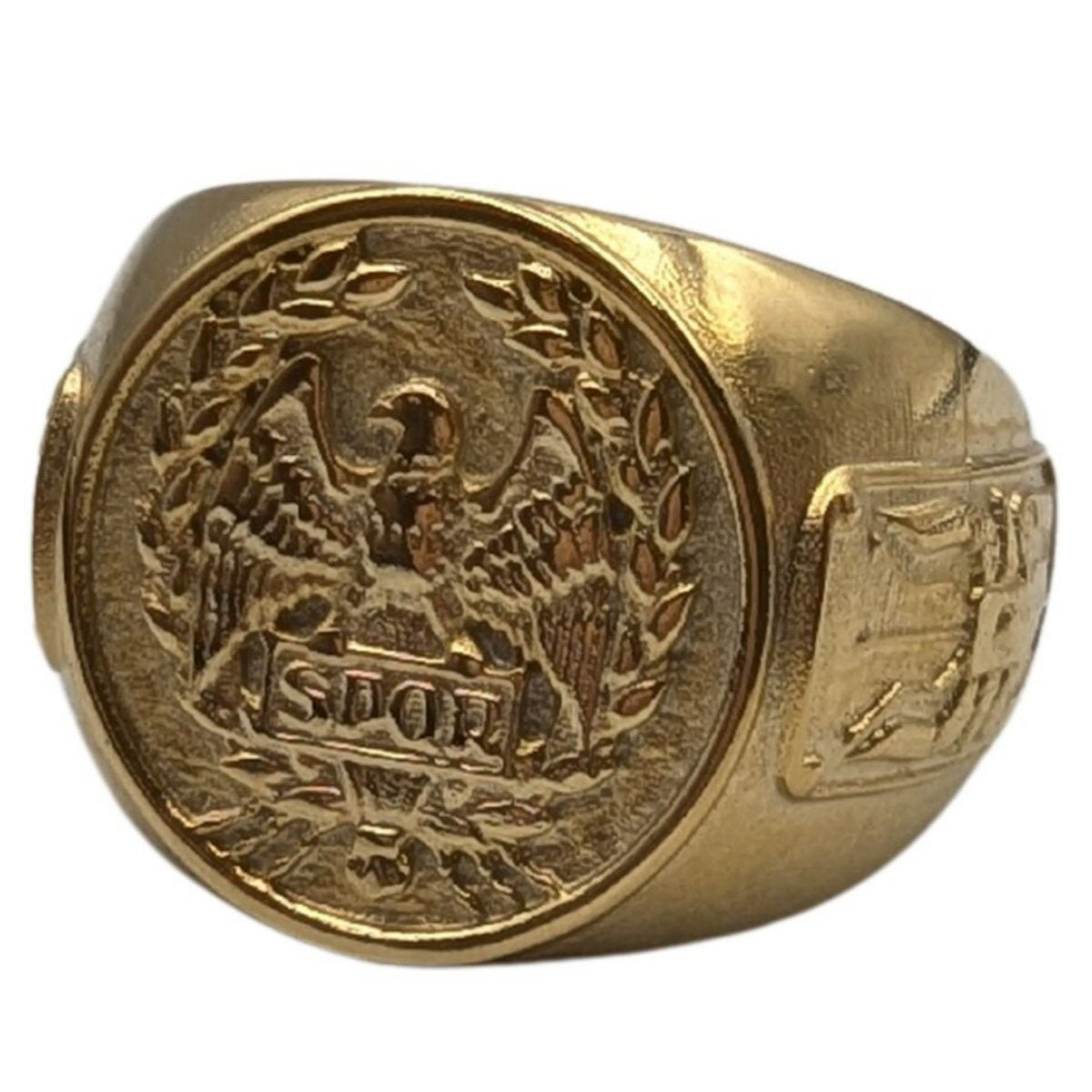 Цей перстень з орлом відображає сутність Стародавнього Риму та його незламний дух. Центральним елементом перстня є Аквіла, римський герб з орлом, який слугував символом честі, сили та непохитної рішучості римських легіонів. По обидва боки від Аквіли ви знайдете деталізовані римські щити, що додають автентичного відтінку. На довершення всього, перстень гордо несе шановану емблему SPQR, знаковий символ влади та панування Риму.